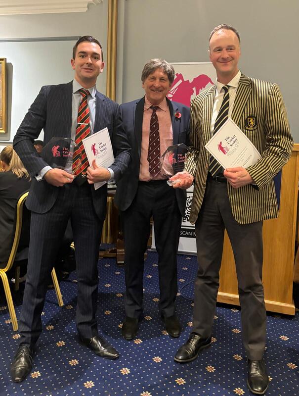 The photograph shows David (left) and Will (right) receiving their awards from John Barclay, President of The Cricket Society, at the society’s Annual Awards Lunch at the Union Jack Club, London, on Thursday, 6th November.